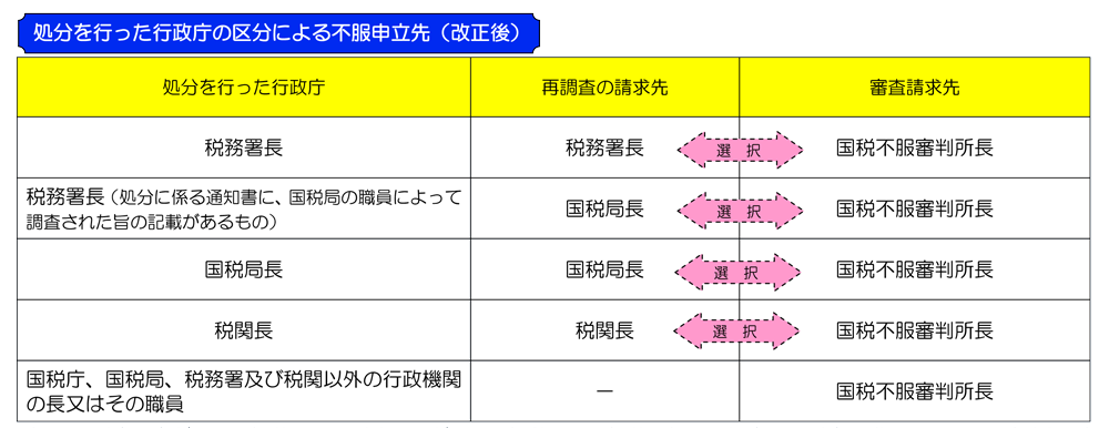税務署長が行った処分に不服がある場合には、納税者の選択により、税務署長などに対する「異議申立て」を行わずに、直接、国税不服審判所長に対する「審査請求」を行うことができるようになりました。
